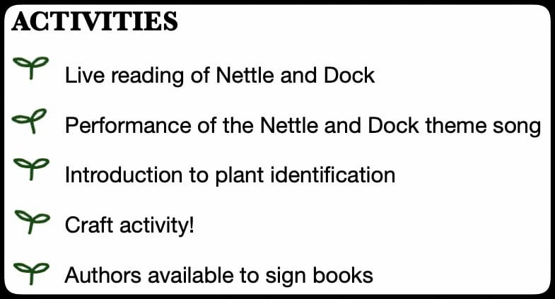 Meet the authors of Nettle and Dock and enjoy an hour of reading, music and fun! Please contact us at meetnettleanddock@gmail.com for the Fundraiser Pack